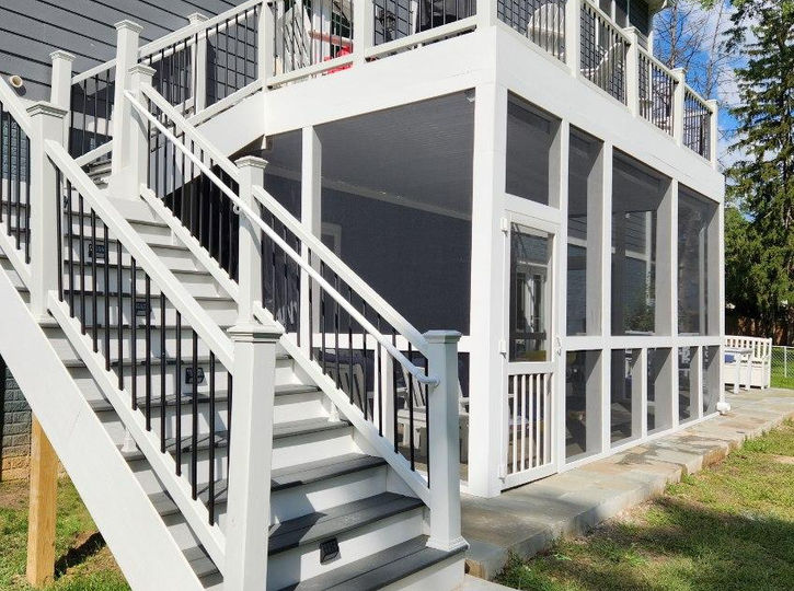 The old deck had rotted floor boards and warped railings. Our team replaced the floor with Trex Enhance Clam Shell. The railings were replaced with Trex Enhance white railings with aluminum clusters and cocktail top. All the exposed wood like fascia and stair singers were wrapped in white PVC. The area underneath were enclosed with vinyl lattice.